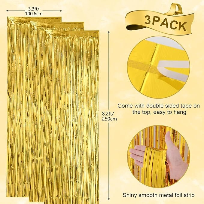 3 Pack 3.3X8.2 Feet Gold Foil Fringe Backdrop Curtains, Tinsel Streamers, Fringe Backdrop for 2025 New Years Eve, Graduation, Birthday, Baby Shower, Gender Reveal, Disco Party